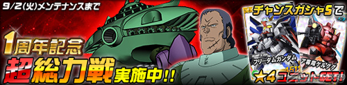 超総力戦「ドズル搭乗ビグ・ザム」を倒した際に引くことができる「チャンスガシャ」、「チャンスガシャS」の利用回数が、期間中は通常時の2倍になる。