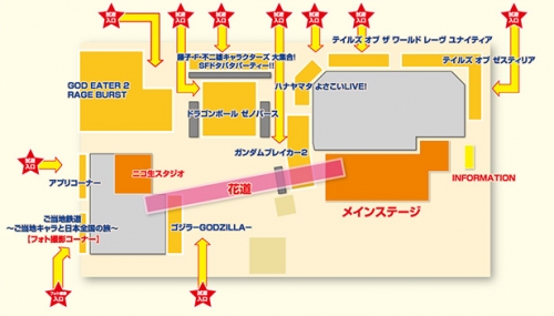 巨大オブジェなどのフォトコーナーを設けた「ガンダムブレイカー2」、「GOD EATER 2 RAGE BURST」、「ドラゴンボール ゼノバース」、「テイルズ オブ ゼスティリア」をはじめ、全15タイトルの家庭用ゲームやスマートフォン向けアプリの試遊を実施する予定です。