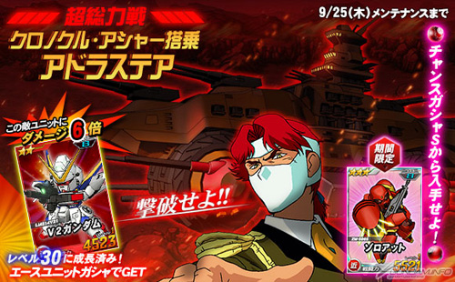 同機を倒した際に引くことができるチャンスガシャSには、「★3 ゾロアット」を獲得できるチャンスがあるほか、エースユニットガシャには「クロノクル搭乗アドラステア」に対し6倍の攻撃力を発揮する「★2 V2ガンダム」が追加される。