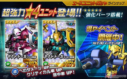 エースユニットガシャに「★4 ヤクト・ドーガ(クェス専用機)」、「★4 ヤクト・ドーガ(ギュネイ専用機)」などが登場するので、ぜひチェックしてみよう。