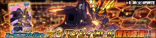 エー スユニットガシャに「★3 バンシィ(NT-D)」、「★3 ジェスタ」、「★3 ザクI・スナイパータイプ(UC)」など、強力ユニットが多数登場する。また、プラチナパイロットガシャには「★3 ヒイロ・ユイ」、「★3 ドモン・カッシュ」、「★3 ラカン・ダカラン」、「★3 プルツー」など強力なパイロットが登場するので、あわせてチェックしてみよう。