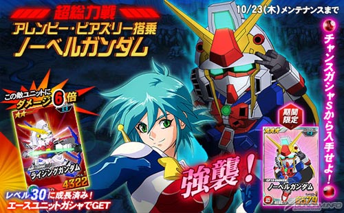 同機を倒した際に引くことができるチャンスガシャSには、「★3 ノーベルガンダム」を獲得できるチャンスがあるほか、エースユニットガシャには「アレンビー搭乗ノーベルガンダム」に対し6倍の攻撃力を発揮する「★2 ライジングガンダム」が追加される。