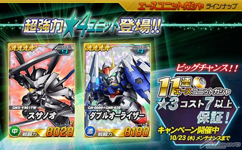 さらに、本日よりエースユニットガシャに「★4 スサノオ」、「★4 ダブルオーライザー」、「★3 ゴッドガンダム」が登場。「★4 スサノオ」と「★4 ダブルオーライザー」は、強化パーツとしてそれぞれ「GNドライブ[T]」と「ツインドライヴ」を、「★3 ゴッドガンダム」はスペシャルウェポン「爆熱ゴッド・フィンガー」を搭載する強力な機体となっているので、ぜひとも手に入れよう。