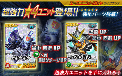 さらに、本日よりエースユニットガシャに「★4 ビギナ・ギナ」と「★4 ガンダムキュリオス(MS)」が登場。強化パーツとして、それぞれ「フィン・ノズル」、「GNドライヴ」を装備する強力な機体となっているので、ぜひとも手に入れよう。