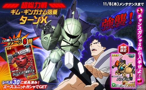 超総力戦には11月6日(木)までの期間限定で「ギンガナム搭乗ターンX」が登場し、期間中に任務を実行すると、まれに遭遇することがある。