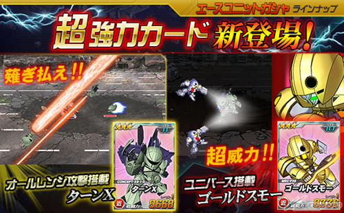 さらに、本日よりエースユニットガシャに「★3 ターンX」と「★3 ゴールドスモー」が登場。スペシャルウェポンとして、それぞれ「オールレンジ攻撃」、「ユニバース」を搭載する強力な機体となっているので、ぜひとも手に入れよう。