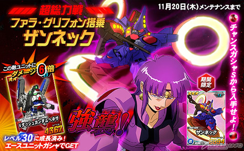 同機を倒した際に引くことができるチャンスガシャSには、「★3 ザンネック」を獲得できるチャンスがあるほか、エースユニットガシャには「ファラ搭乗ザンネック」に対し6倍の攻撃力を発揮する「★2 Vダッシュガンダムヘキサ」が追加される。