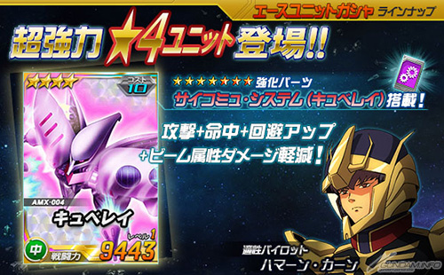 さらに、エースユニットガシャに「★4 キュベレイ」、プラチナパイロットガシャに「★3 ハマーン・カーン」が追加されたほか、「11連ガシャ★3コスト7以上保証キャンペーン」、「任務獲得GPアップ期間」が同時に開始された。