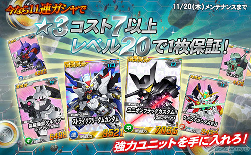 キャンペーン期間中は、11連エースユニットガシャを引くと、最後に登場する1機が必ず「★3コスト7以上」のユニットとなっている。この機会に、強力ユニットを手に入れよう。