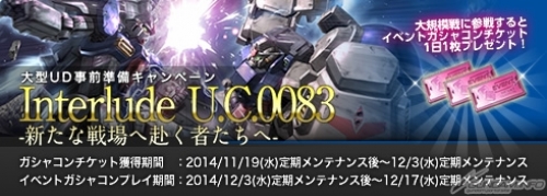 本日よりスタートした「Interlude U.C.0083」は、大型アップデートに向けた事前準備キャンペーンであり、期間中に大規模戦に参戦すると、アップデート後にゲーム内で公開される特別なガシャコンをプレイできる「イベントガシャコンチケット」を、1日1枚獲得することができる。
