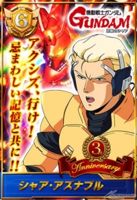キャンペーンでは、レジェンド「シャア・アズナブル」などを獲得することができる「3周年記念ガシャ」が期間限定で販売される。ガシャは、初回のみ10モバコインで楽しむことができるスペシャル仕様となっている。ぜひともこの機会にゲームをプレイして、ガシャを利用してみよう。