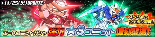 エースユニットガシャに「★3 ガンダムエクシア(トランザム)」、「★3 ダブルオーガンダム」など、強力なユニットが多数登場する。
