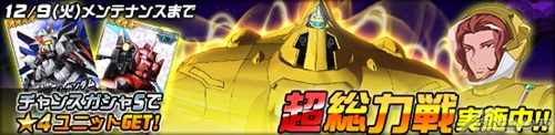 同機を倒した際に引くことができるチャンスガシャSには「★4 フリーダムガンダム」、「★4 ガンダム試作一号機フルバーニアン」、「★4 百式」、「★4 シャア専用ゲルググ」、「★4 ゲーマルク」などを獲得できるチャンスがあるほか、エースユニットガシャには「アレハンドロ搭乗アルヴァトーレ」に対し3倍の攻撃力を発揮する「★2 ガンダムキュリオス(MS/トランザム)」が追加される。