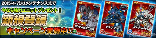 2015年4月7日(火)までの期間中に新しくゲームを開始したプレイヤーを対象に、3機の強力なユニット「★2 ガンダム試作二号機」、「★2 ケンプファー」、「★2 ガンダムF91」が、Lv20に成長した状態でプレゼントされる。ぜひともこの機会に、ゲームをプレイしてみよう。