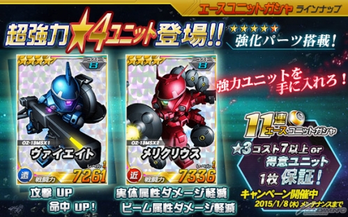 2015年1月8日(木)メンテナンス開始までの期間限定で、「★3コスト9以上獲得確率2倍キャンペーン」と「11連ガシャ★3コスト7以上 or 得意ユニット1枚保証キャンペーン」が同時開催される。ぜひともこの機会にゲームをプレイしてみよう。