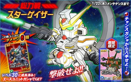 同機を倒した際に引くことができるチャンスガシャには「★3 ヴェルデバスターガンダム」を獲得できるチャンスがあるほか、エースユニットガシャには「スターゲイザー」に対し6倍の攻撃力を発揮する「★2 ブルデュエルガンダム」が追加される。