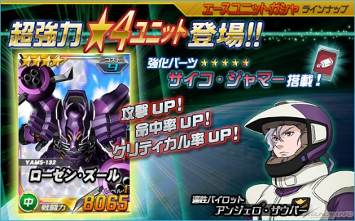 本日よりエースユニットガシャに「★4 ローゼン・ズール」、「★3 ジェスタ(ベースジャバー搭乗)」などが登場。「★4 ローゼン・ズール」は強化パーツに「サイコ・ジャマー」を搭載した強力なユニットとなっているので、ぜひとも手に入れよう。また、プラチナパイロットガシャには「★3 アンジェロ・ザウパー」や「★3 ナイジェル・ギャレット」などが登場する。