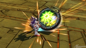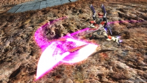 ▲チャージ射撃武装では、両腕部のビーム・シールドを展開し突撃モードに移行する。突撃モード中は、自機左右からの射撃攻撃を防ぐほか、自機正面に攻撃判定が発生する。