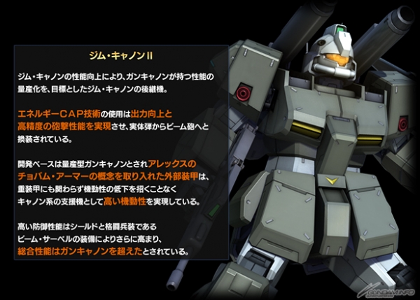「ジム・キャノンII」は、ガンキャノンが持つ性能の量産化を目標としたジム・キャノンの後継機。エネルギーCAP技術の使用は出力向上と高精度の砲撃性能を実現させ、実体弾からビーム砲へと換装されている。開発ベースは量産型ガンキャノンとされ、アレックスのチョバム・アーマーの概念を取り入れた外部装甲により、キャノン系の支援機として高い機動性を実現。総合性能はガンキャノンを超えたとされている。