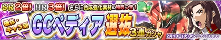 GCペディアキャラ選抜3連ガシャ | 400CP | 900CP | ・SR2倍、HR3倍 ・強化カプセル×2枚 ・パイロットのスタミナ全快 ・サポートのスタミナ全快 |