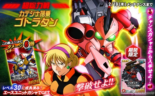 超総力戦には2月19日(木)までの期間限定で「カテジナ搭乗ゴトラタン」が登場し、期間中に任務を実行すると、まれに遭遇することがある。