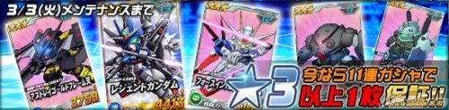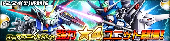 エースユニットガシャに、「★4 フォースインパルスガンダム」、「★4 レジェンドガンダム」、「★3 アストレイゴールドフレーム天」が登場した。それぞれ強化パーツとして「★4 フォースインパルスガンダム」は「VPS装甲」を、「★4 レジェンドガンダム」は「ハイパーデュートリオンエンジン」を搭載する強力なユニットとなっているので、ぜひとも手に入れよう。