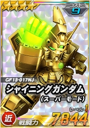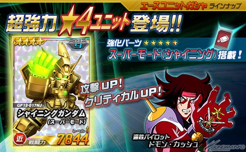 本日よりエースユニットガシャに、強化パーツとして「スーパーモード(シャイニング)」を搭載した「★4 シャイニングガンダム(スーパーモード)」が追加されたほか、「★3 ウイングガンダムゼロ」、「★3 サザビー」、「★3 V2ガンダム」が再登場した。