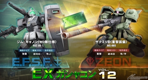 期間中に戦闘報酬から入手可能な「EXガシャコンチケット」でプレイできる期間限定のガシャコン第12弾「EXガシャコンVol.12」では、地球連邦軍に「ジム・キャノン(WD隊仕様)」が、ジオン公国軍に「ザクIIS型(重撃装備)」がそれぞれ新参戦する。