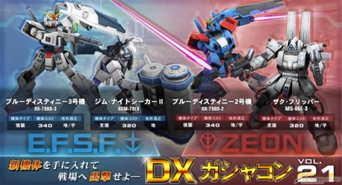 本日より、「DXガシャコンVOL.21」の配信がスタートした。今回の目玉機体は、「ブルーディスティニー3号機」、「ジム・ナイトシーカーII」、「ブルーディスティニー2号機」、「ザク・フリッパー」の新機体4機。新たに登場する「EXAMシステム」や即時修理に役立つ「ツイン・リカバリートーチ」などの武装で戦場に旋風を巻き起こそう。