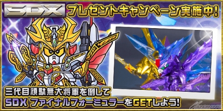 Play through a special stage in-game to unlock the exclusive Sandaime Gundam Dai-Shogun character. Plus, follow the link that appears after completion and enter to win one of ten SDX Final Formula figures.