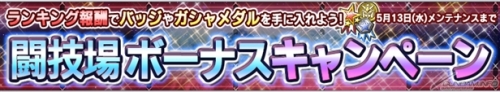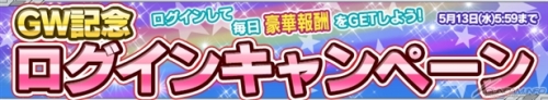 GWを記念した豪華ラインナップのガシャが登場。1日4回限定で、3枚目はHR以上の出現率が60%となる。また、「合成強化ガシャメダル×3枚」と「レアバッジ×1個」が特典としてつく。