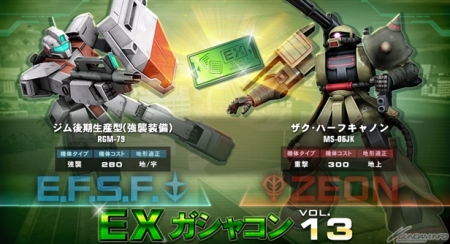 Try out the 13th EX Gashacon, spinnable only with play rewards, for the Federation's "Later GM (Assault)" and Zeon's "Zaku Half Cannon"!
