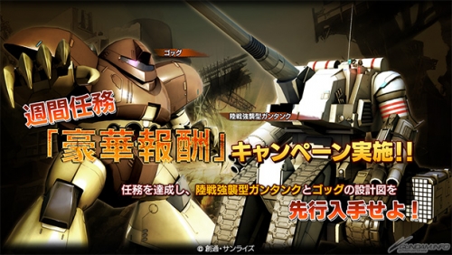 週間任務「豪華報酬」キャンペーンでは、期間中に出撃すると「CP(キャンペーンポイント)」がカウントされ、CPが一定数に達するごとに特別な報酬を獲得可能。報酬には、新たなイベント機体「陸戦強襲型ガンタンク」や「ゴッグ」の設計図先行入手など、豪華な報酬が数多く用意されている。