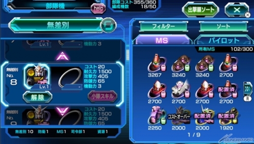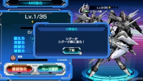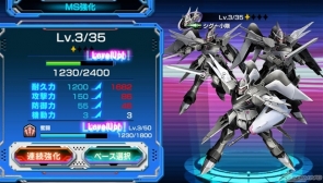 量産機など、特定の機体同士を合成すると、単機のMSが複数機のMSによる「小隊」に進化する。小隊を部隊に組み込んで、大量のMSを指揮しよう。