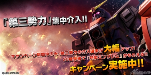 期間中のみ、第三勢力の介入確率が大幅にアップする。また、第三勢力を20機撃破すると「特製エンブレム」がプレゼントされる。