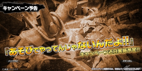 本作最初のイベントとなった「…任務、了解!!」(ガンダムW)に続き、新たなイベントが判明した。近日実装予定の新たなイベント「あそびでやってんじゃないんだよ!!」キャンペーンでは、期間中のみ「Ζガンダム」と「ハンブラビ」が開発・強化できる特別なパーツがドロップする。現在開催中の 「『第三勢力』集中介入!!」キャンペーンで、機体開発や強化に必要な「開発ポイント」をしっかりためて、新たなキャンペーンに備えよう。
