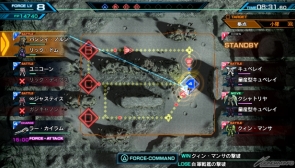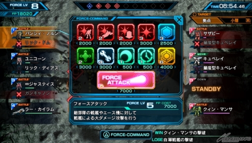 ▲コマンドモードで△ボタンを押すとフォースコマンドメニューが開く。FPを消費してコマンドを使用し、戦艦からの支援を要請。コマンドには、一時的に自軍全体の攻撃力を上げるなどの様々な種類があり、フォースレベルを上げることで使用できるコマンドが増えていく。