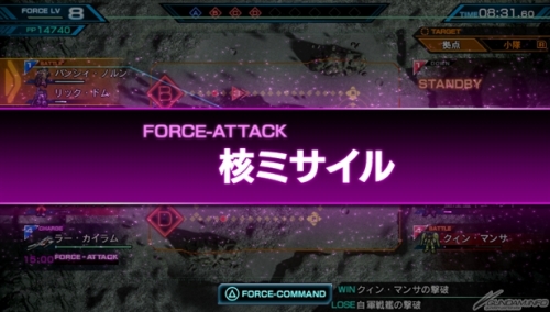 フォースアタックとは、フォースコマンドの1種で、戦艦専用の攻撃コマンドのこと。戦艦が出撃する部隊戦ミッションで「勝利条件が戦艦もしくはMSの撃破」の際に使用可能で、場所や距離に関係なく、条件対象の戦艦もしくはMSに対して、戦艦からの攻撃で直接ダメージを与えることができる。