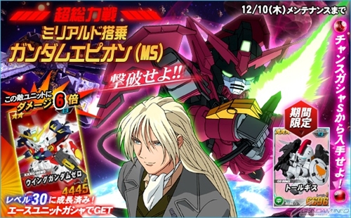 超総力戦には12月10日(木)までの期間限定で「ミリアルド搭乗ガンダムエピオン(MS)」が登場し、期間中に任務を実行するとまれに遭遇することがある。