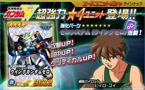 本日よりエースユニットガシャに、「★4 ウイングガンダムゼロ」や「★3 ガンダムデスサイズヘル」が追加された。「★4 ウイングガンダムゼロ」は、強化パーツに「ゼロシステム(ウイングゼロ)」を搭載する強力なユニットとなっているので、ぜひとも手に入れよう。