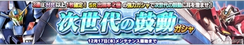 「SR Ζガンダム」、「SR ソードインパルスガンダム」など新規カード8枚が追加されたガシャ。特典として、SRの出現率2倍、3連ガシャの3枚目はHR以上確定となっている。