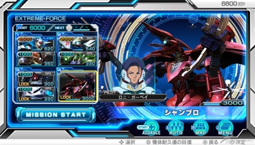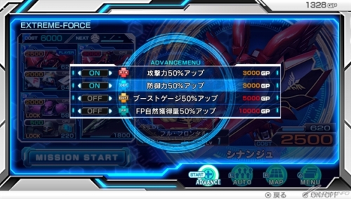 「アドバンス」とは、GPを消費することで、部隊編成した全機体をパワーアップさせる新機能。攻撃力アップやブーストゲージの効果時間延長など様々な効果があり、GPを大量に消費する分、絶大な効果を得られる。ミッションに応じて使いたい効果を「ON」にしてミッション攻略に挑もう。