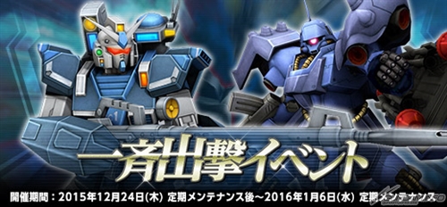 2016年1月6日(水)までの期間中、大規模戦に参戦することで獲得できる「出撃ポイント」に応じて、様々な豪華報酬を獲得することができる。今回は新機体「ガンナーガンダム」と「ギラ・ドーガ(レズン・シュナイダー機)」が登場。そのほかにも豪華アイテムを獲得できるチャンスとなっているので、お見逃しなく。