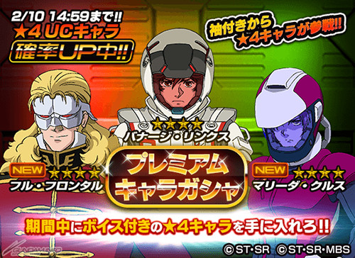 「プレミアムキャラガシャ」に、ボイス付き「フル・フロンタル(★4)」と「マリーダ・クルス(★4)」が追加。また、「バナージ・リンクス(★4)」も、ボイスが付いて再登場する。