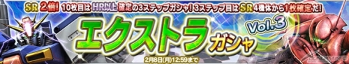 各ステップ10連の3段階ステップアップガシャになっており、各ステップ1日1回限り引くことができる。SR出現率が2倍になっており、1から2ステップ目は10枚目がHR以上確定、3ステップ目は「SR ΖΖガンダム」、「SR ガーベラ・テトラ」、「SR スサノオ」、「SR ダブルオーガンダム」の中から1枚確定となっている。