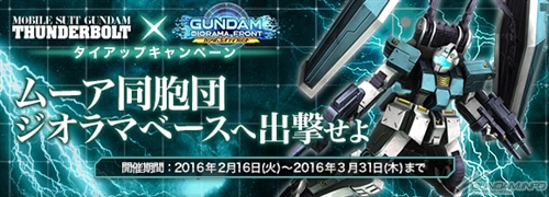 キャンペーンは、第1話と第2話が大ヒット有料配信中のオリジナルアニメーション『機動戦士ガンダム サンダーボルト』とコラボレーションして開催されるもので、期間中にゲーム内でシリアルコードを入力すると、サンダーボルト仕様の「ジム(ランドセル装備)」を入手することができる。開催期間は3月31日(木)まで。