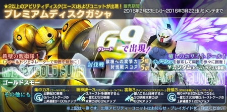 ガシャステーションの内容が更新され、本作初となる範囲回復、範囲無敵のGバーストを持つ「∀ガンダム(ビーム・ライフル装備)」や「ゴールドスモー」ほか4機の目玉ユニットが登場。いずれも、同時開催中のイベント「討伐戦『月と地球』」で役立つ特効ステータスが付く。