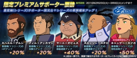 「限定プレミアムサポーター要請」では、討伐戦「月と地球」にて特効対象となる量産機(∀シリーズ)の要請確率がアップする。サポーターを手に入れて討伐戦を有利に進めよう。