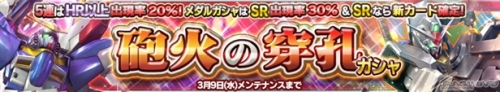 「SR V2バスターガンダム」、「SR 0ガンダム(実戦配備型)」、「SR ウッソ・エヴィン」、「SR リボンズ・アルマーク」など新規カード8枚が追加されたガシャ。5連はHR以上出現率20%で、「砲火の穿孔メダル 1~3枚」と「合成強化ガシャメダル×5枚」が特典として付く。「砲火の穿孔記念メダル」を10枚消費することで、SR出現率30%、SRなら新規カード確定の「砲火の穿孔メダルガシャ」を利用できる。