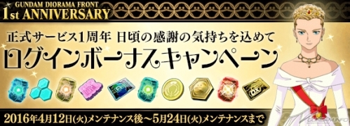 ログインボーナスキャンペーンでは、ログイン日数に応じて、資金、資源をはじめ、ジオラマ施設の建設や機体の修理、開発に役立つ各種チャージャーアイテム、ハロメダル、レアチップなどのアイテムがプレゼントされる。さらに、10日目、20日目、30日目にはDXガシャチケットも贈られ、ログイン日数に応じてもらえる量も多くなっている。